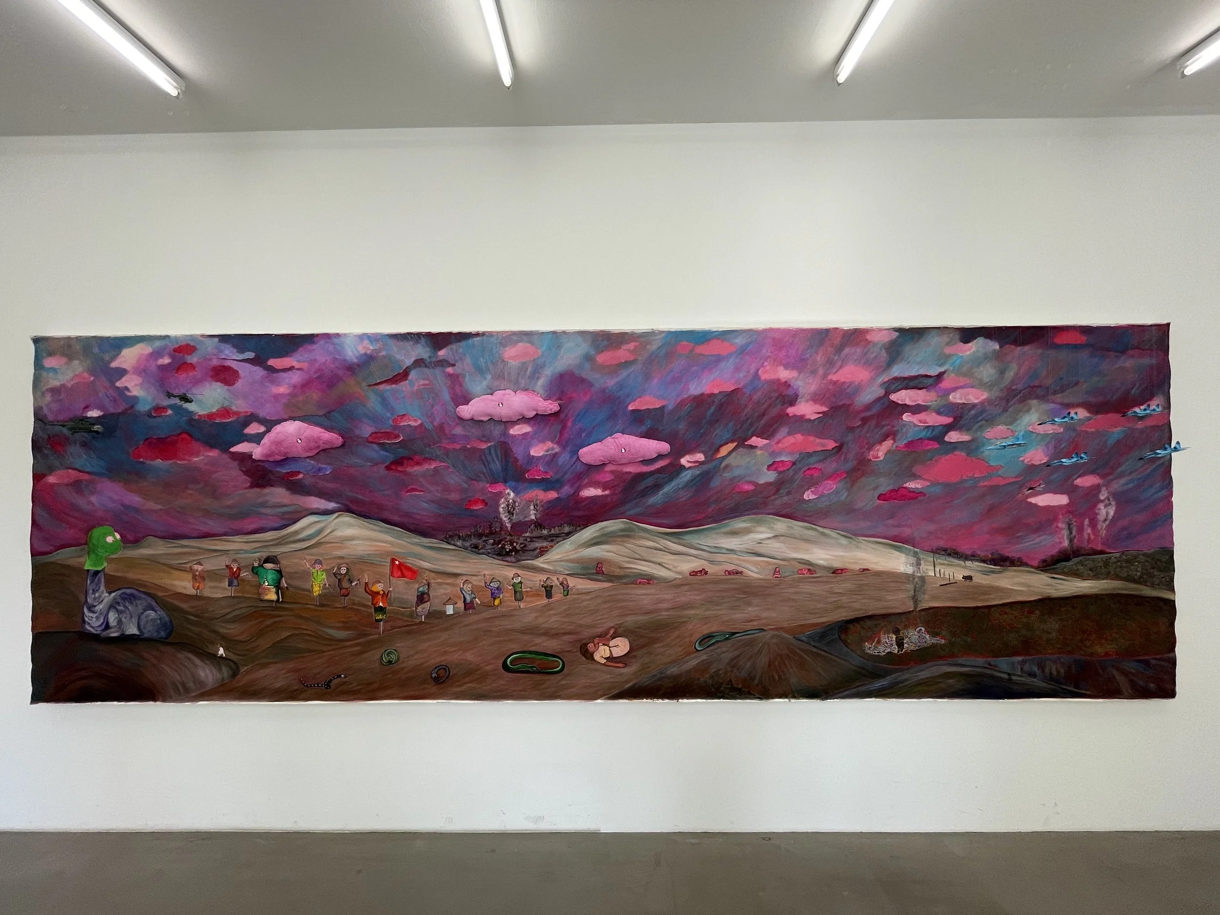 When fires burn in war zones after bombing, soot particles scatter the sunlight in such a way that the sky turns unnatural shades of yellow and orange. It will not turn pink or purple under these conditions. This color spectrum only occurs naturally sunrise or sunset. By painting the sky pink and purple in Lady Farmers’ Magenta Sky, Zoncy Heavenly creates an alternative narrative, one where it is not war, but one’s own imagination that determines an environment’s atmosphere. Across Zoncy Heavenly’ practice which spans photography, installation, painting, performance, and mediation work-art serves as a means of processing collective trauma.